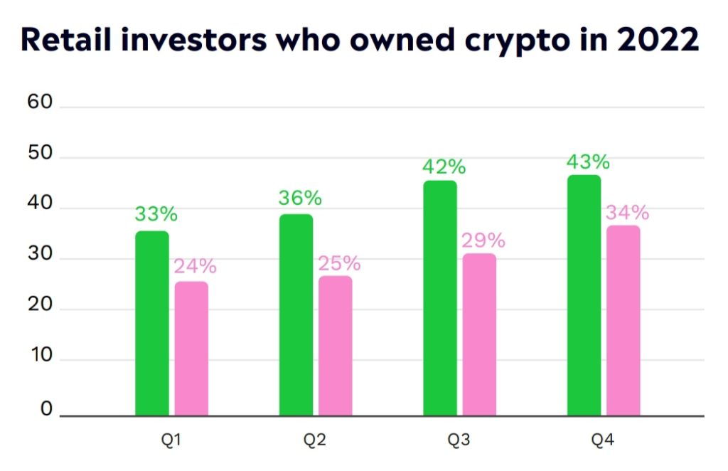 Hasil survei bursa saham dan kripto global eToro menemukan terjadi peningkatan proporsi investor ritel kripto dari 36% pada kuartal tiga (Q3) menjadi 39% pada Q4 2022. Peningkatan salah satunya dipicu oleh bertambahnya portofolio investasi kripto yang dimiliki kaum perempuan dalam periode tersebut.