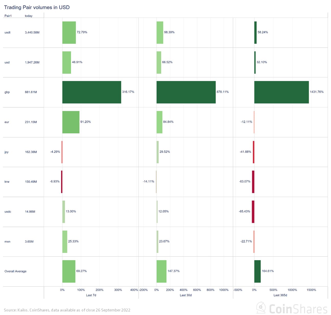 Data lainnnya memperlihatkan perbandingan paritas bitcoin terhadap uang fiat lainnya. Volume BTC/GBP naik lebih dari 1400% di atas rata-rata tahunannya. Sementara volume BTC/USDT hanya 58% dan volume BTC/USD naik 32% lebih tinggi.