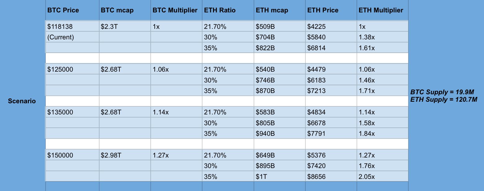 Yashasedu pun mengatakan bahwa jika BTC perlu naik 25% dari harga saat ini ($119.356) untuk mencapai $150.000. Jika itu terjadi, ia katakan, ETH berpotensi melonjak ke $8.656, dengan asumsi proporsinya kembali menyentuh 35% dari kapitalisasi pasar Bitcoin seperti pada siklus sebelumnya.