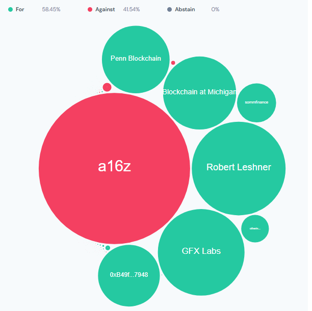 Aksi a16z itu membuat persaingan menjadi cukup ketat antara komunitas yang setuju dengan Wormhole (58.45%) dan yang tidak setuju (41,54%).