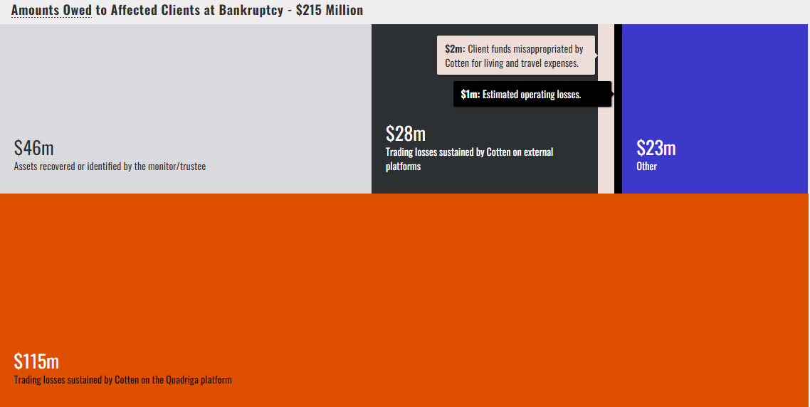 Menurut Komisi Sekuritas Ontario (OSC), per 5 Februari 2019, QuadrigaCX berutang kepada klien sekitar $215 juta. Namun Ernst & Young baru memulihkan aset exchange tersebut senilai $46 juta sehingga masih ada kekurangan sekitar $169 juta.