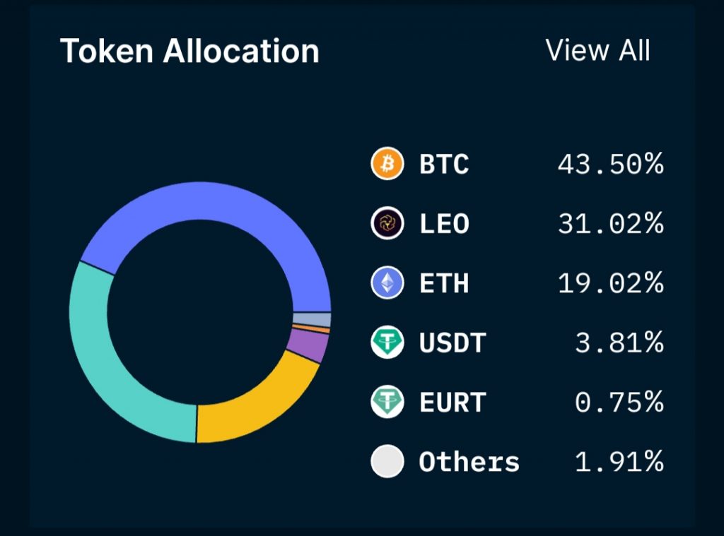 Berdasarkan persentasenya, data Nansen mencatat jumlah BTC mencapai 43,05â„… dari total aset, sedangkan ETH 18,85%. Beberapa token lain yang dijadikan aset di antaranya LEO, USDT, dan EURT. Adapun total nilai cadangan aset Bitfinex mencapai hampir $8 miliar.