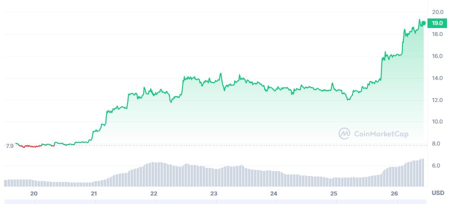 Reli Aptos ini telah dimulai sejak awal tahun. Tercatat kenaikan APT secara year-to-date (YTD) sepanjang awal 2023 mencapai lebih dari 400% dari kisaran $3,5 per keping. Dalam 7 hari terakhir, harga APT terbang nyaris 150% dari $7,8 menjadi di atas $19.