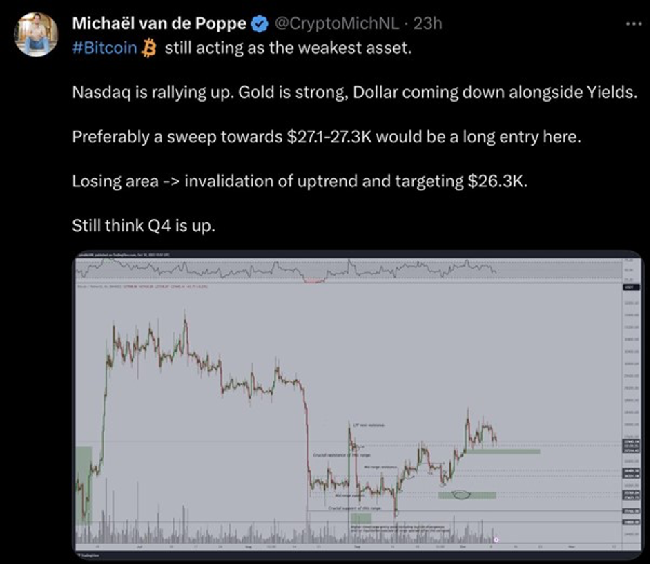 Harga Bitcoin belum mampu menembus resistensi penting pada $28.000 dan saat ini berada di bawah setiap indikator moving average penting dalam kerangka waktu harian, yang membuat TradingView memberikan sinyal “Jual”. Yang membuat situasi ini semakin buruk adalah pasar ekuitas lebih luas khususnya S&P 500 dan NASDAQ-100 yang menunjukkan tanda-tanda kekuatan.