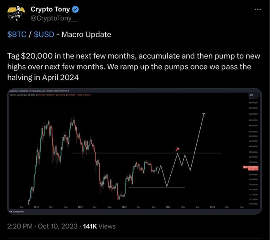Akibatnya, trader terkenal @CryptoTony_ percaya bahwa Bitcoin akan turun ke level harga $20.000 sebelum mengalami kenaikan yang berkelanjutan.