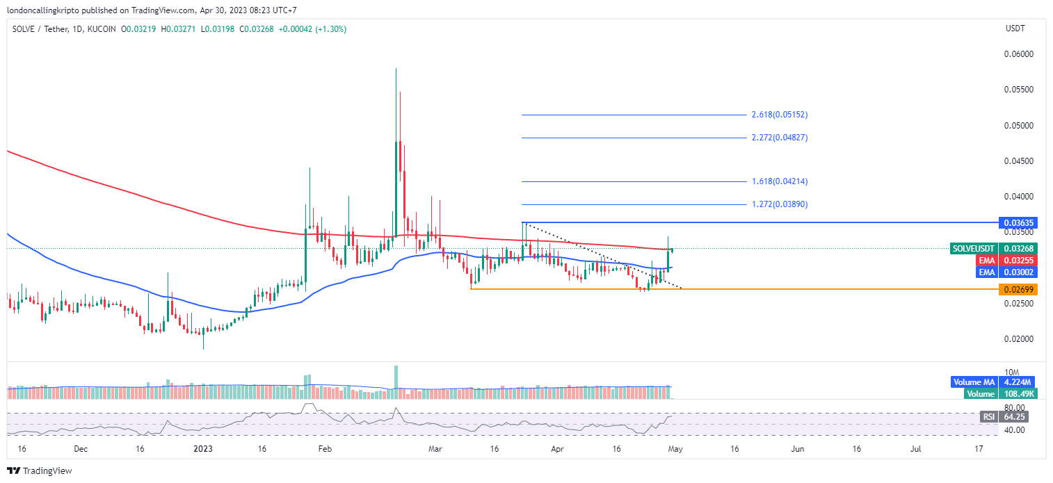 Pergerakan harga SOLVE berhasil breakout garis downtrend pada 25 April dan menjadi pemicu terhadap kenaikan harga saat ini.