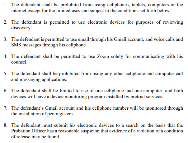 Dia juga untuk sementara dilarang menggunakan VPN setelah Departemen Kehakiman menemukan ia telah dua kali menggunakan VPN untuk menonton pertandingan olahraga. Larangan tersebut akan dibahas lebih lanjut selama sidang 16 Februari.