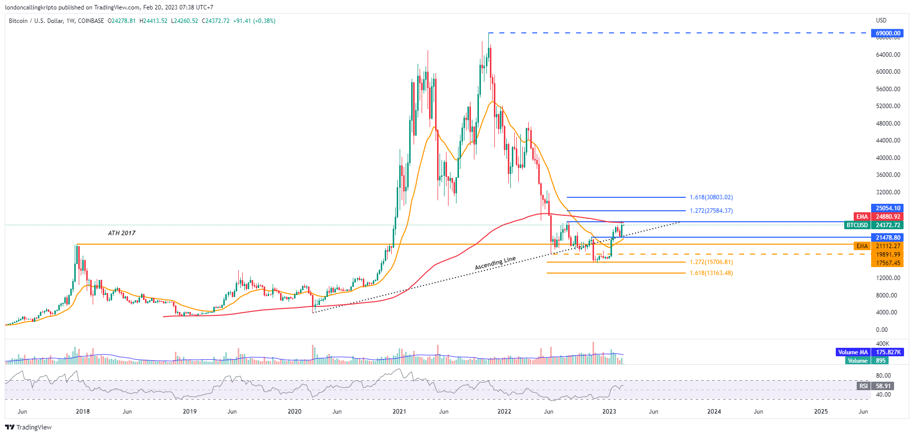 Pergerakan harga Bitcoin kembali rebound setelah menyentuh titik tersebut. Kenaikan harga Bitcoin saat ini tetahan major resistance pada 200-week exponential moving average (EMA) di level $24.879.