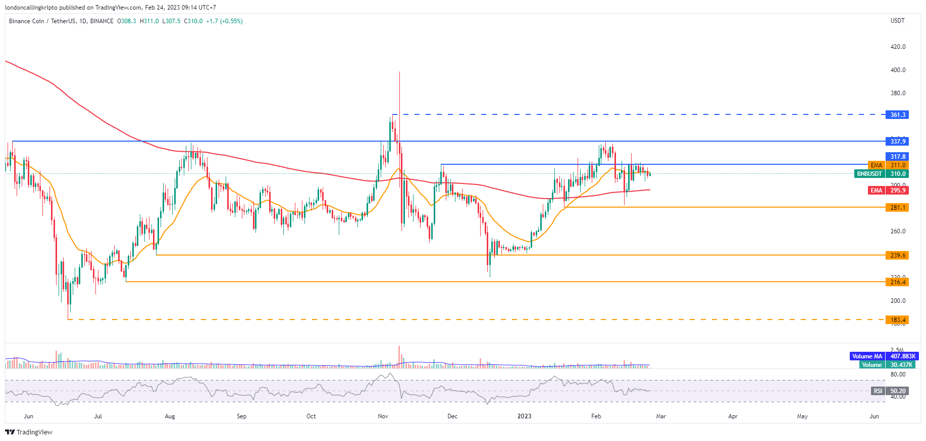 Pergerakan harga BNB berhasil breakdown 20-day EMA di level $311. Penutupan kandil 24 Februari akan menjadi konfirmasi terhadap hal tersebut.