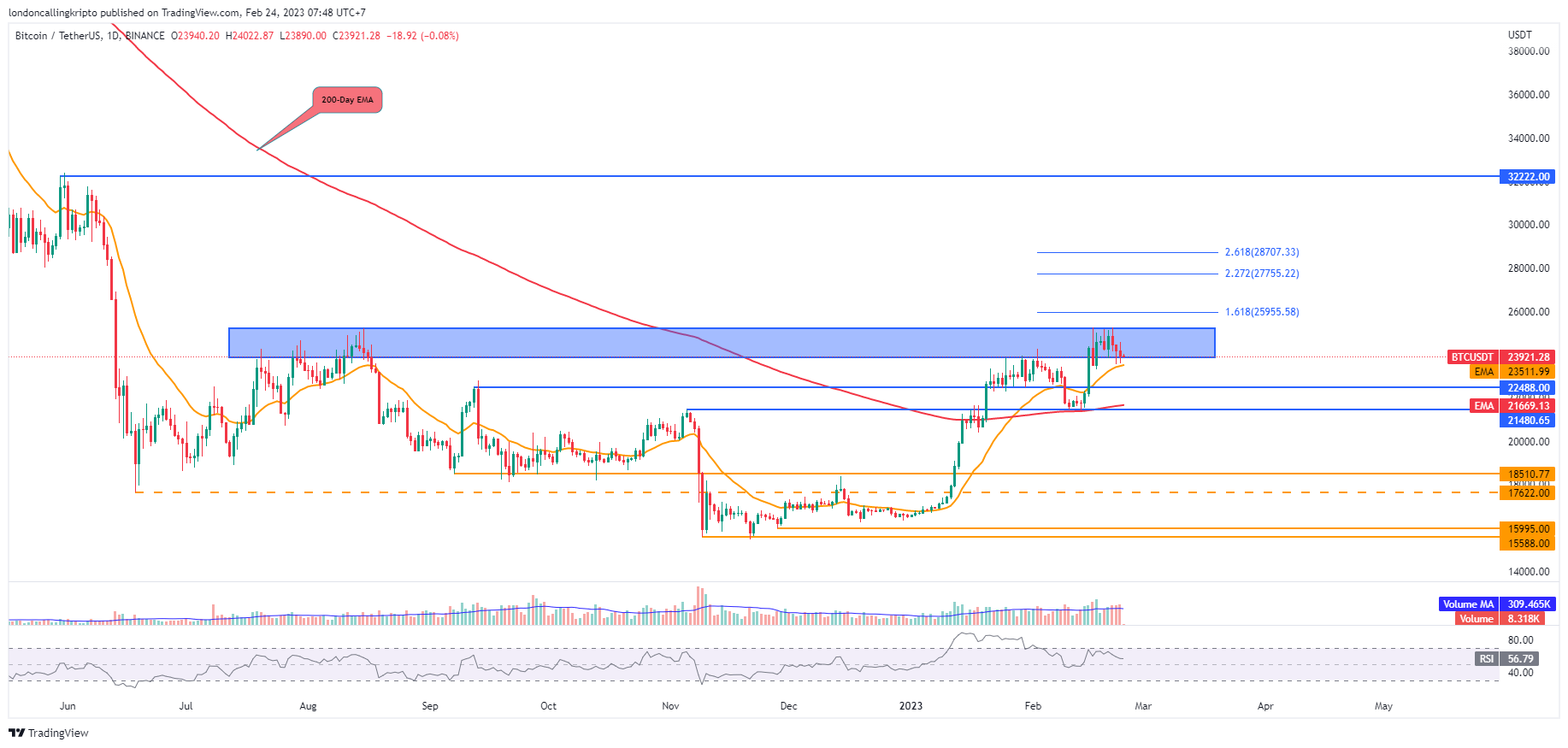 Meskipun mengalami penurunan, pergerakan harga Bitcoin masih bergerak didalam area supply di level $23.888-$25.198.