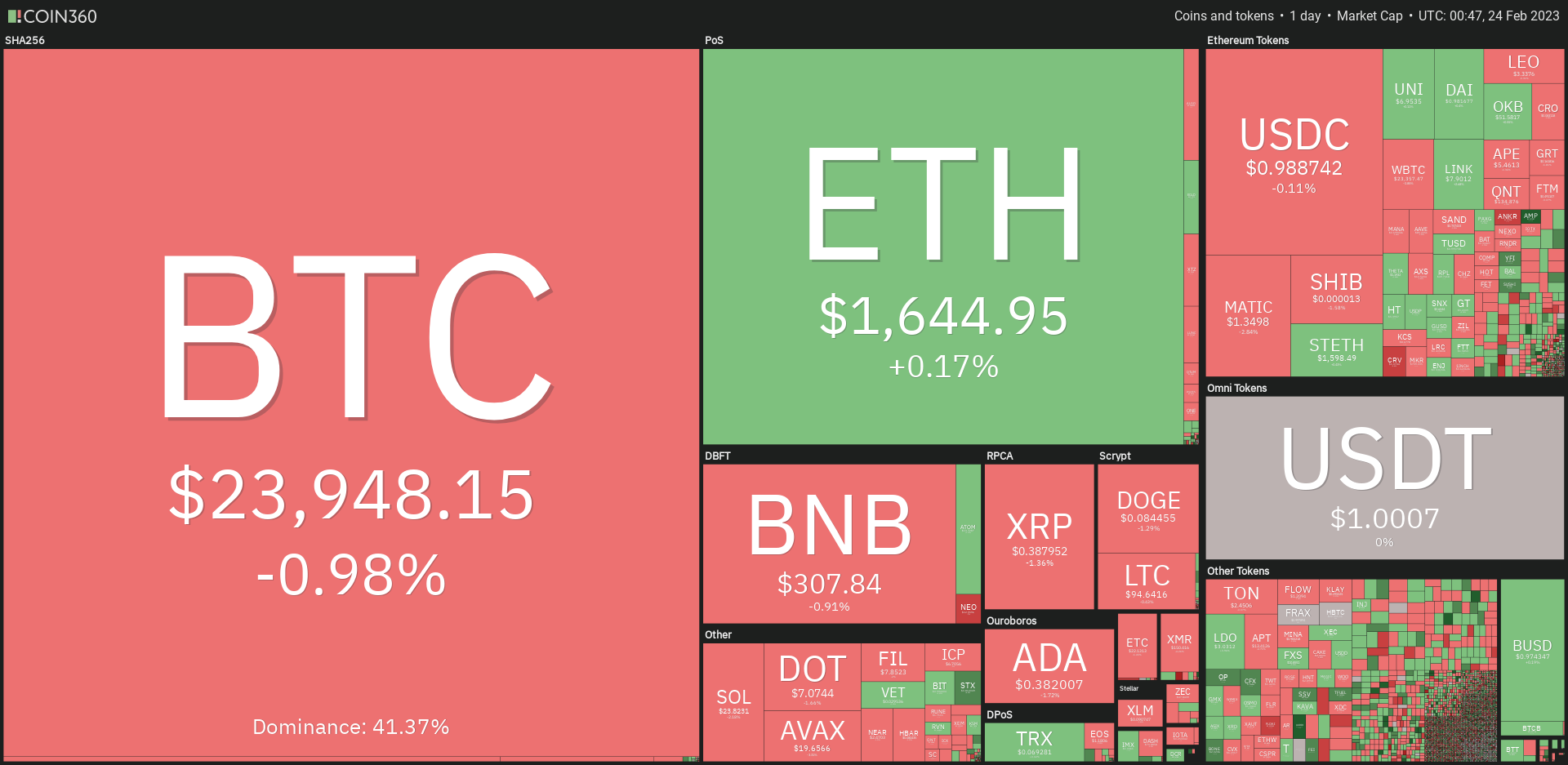 Daily candle Bitcoin pagi ini ditutup pada harga $23.940, level tertinggi berada pada harga $24.599, dan level terendah berada pada harga $23.608.