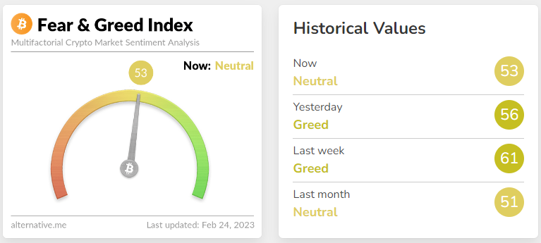 Fear and greed index mengalami penurnan tiga poin, ditutup pada level 53, dan kembali pada kategori Neutral.