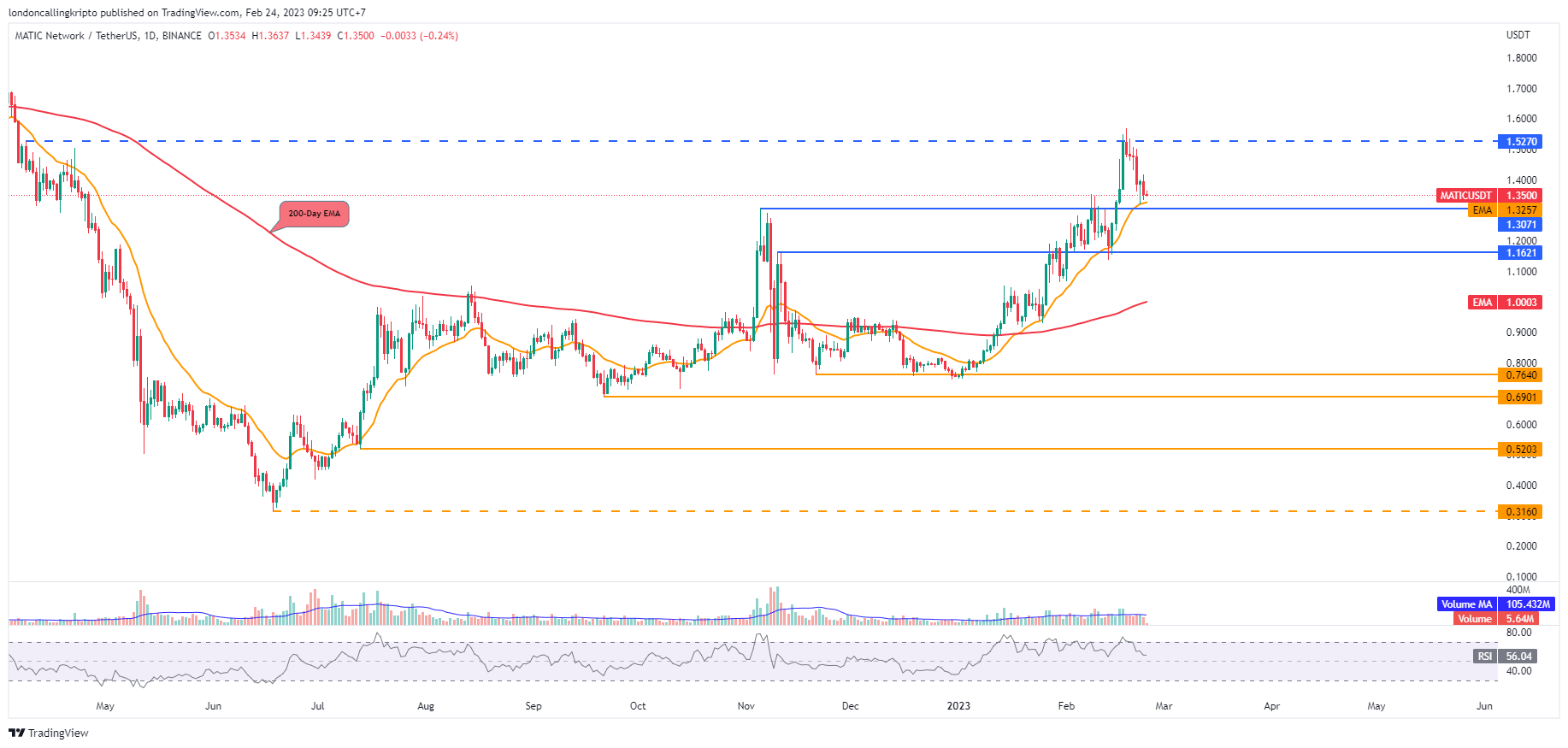 Penurunan harga MATIC terlihat mendekati dinamis support pada 20-day EMA di level $1.3256.