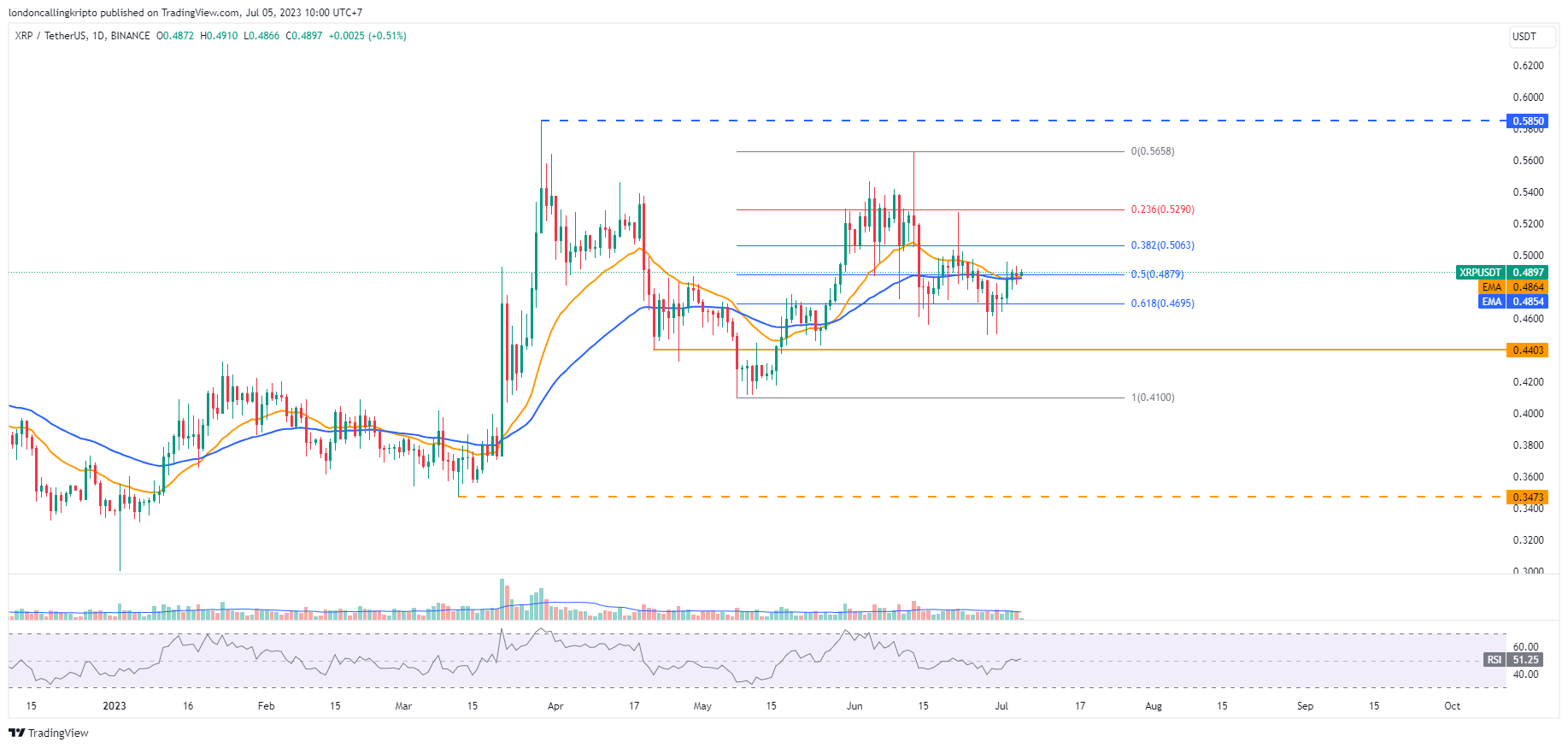 Pergerakan harga XRP berhasil rebound setelah mengalami penurunan pada 28 Juni hingga breakdown harmonic support di level $0,495, tetapi berhasil ditutup diatas titik support tersebut.