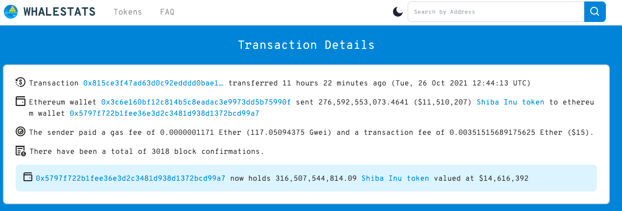Berdasarkan data whalestats.com, seorang whale dengan alamat wallet 0x5797f722b1fee36e3d2c3481d938d1372bcd99a7 telah memborong SHIB sebanyak lebih dari 276 token senilai $11,510,207.