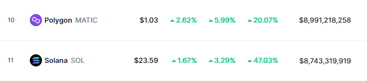Kapitalisasi pasar Solana dan Polygon bersaing ketat dengan masing-masing mencapai $8,7 miliar dan $8,9 miliar. Jika Solana terus mengalami tren kenaikan, bukan tidak mungkin Polygon akan tersusul.