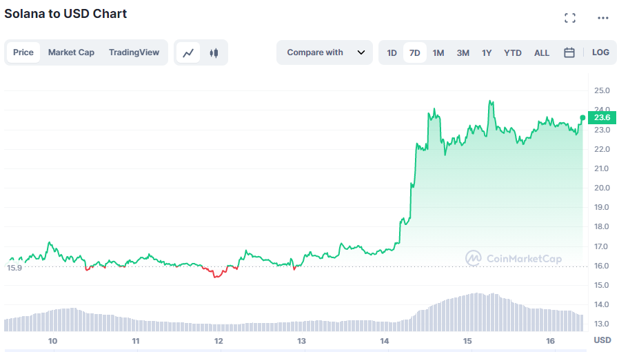 Pergerakan harga SOL dalam sepekan terakhir. (sumber: CoinMarketCap).