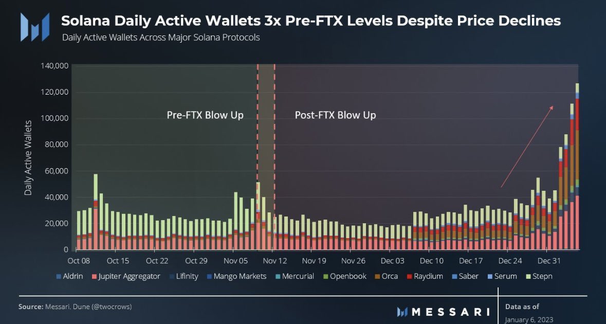 Menurut data Messari, wallet aktif Solana naik lebih dari tiga kali lipat sejak FTX kolaps. Kenaikan mulai terlihat sejak Desember 2022.