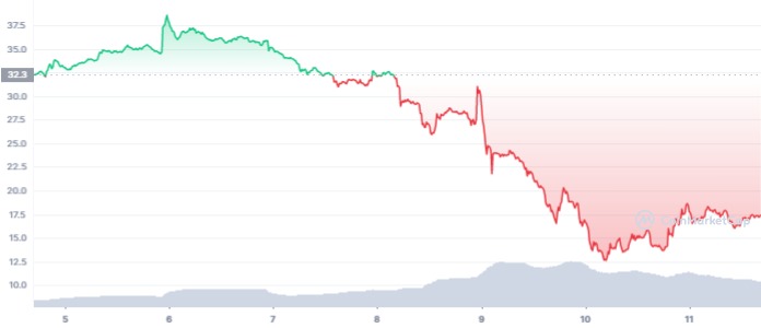 Solana merupakan altcoin klaster besar yang terkena dampak keruntuhan FTX paling parah sejauh ini. Data CoinMarketCap menunjukkan dalam sepekan terakhir harga Solana turun 46.62%. Solana kini juga terlempar dari 10 besar kripto dengan kapitalisasi pasar terbesar.