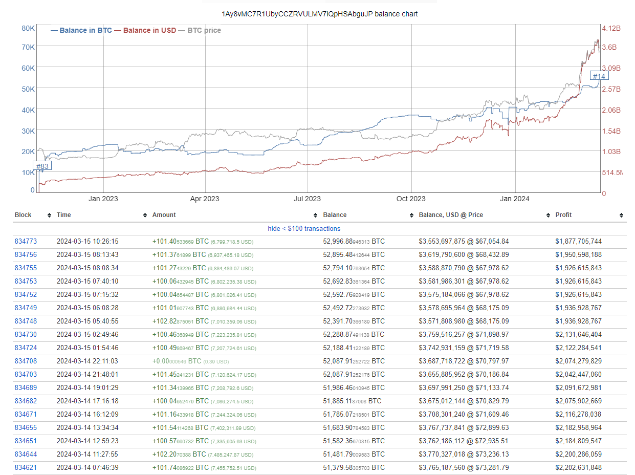 Mr. 100 terus mengumpulkan Bitcoin terlepas dari harga Bitcoin yang hampir mencapai rekor tertinggi, menambahkan 400 BTC pada tanggal 12 Maret, ketika Bitcoin diperdagangkan di atas level $72.000.