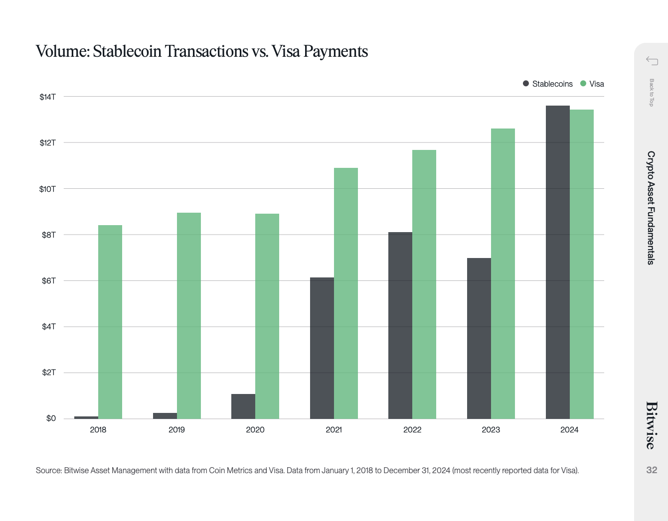 The report noted that stablecoin transaction volume in 2024 reached more than $13 trillion, doubling compared to the previous year. Meanwhile, Visa’s transaction volume only grew by about 2% from 2023 to 2024.