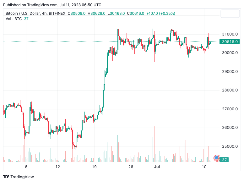 Bitcoin telah naik sekitar 82% sejak awal tahun 2023. Pada Januari 2023 harga BTC berada di level $16.600, saat laporan ini ditulis harga aset kripto terbesar ini telah mencapai $30.585.