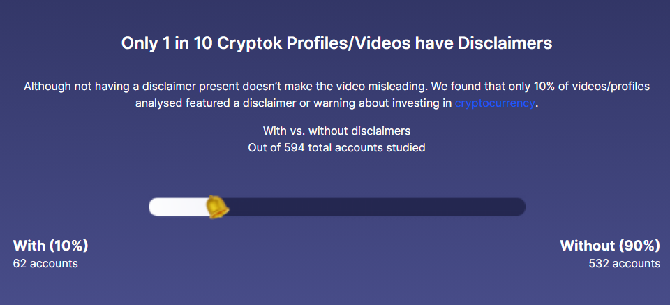 Studi tersebut juga menemukan bahwa hanya satu dari 10 video #cryptok yang berisi disclaimer, yang memperingatkan pengguna tentang risiko berinvestasi di aset digital.