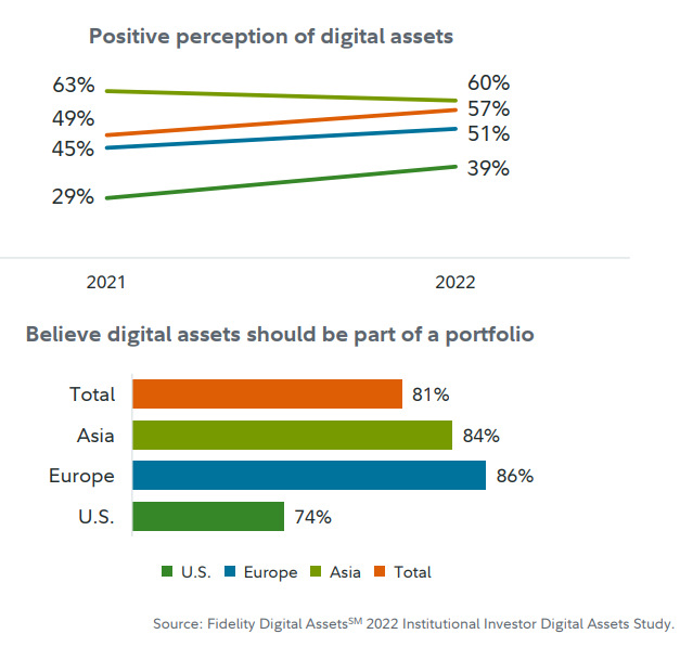Data lainnya menyatakan 57% institusi memiliki persepsi positif tentang aset digital, naik 8% dari tahun 2021. Secara terperinci, persepsi institusi di Asia turun dari 65% ke 60%. Namun di Eropa, naik dari 45% ke 51%, dan AS naik 10% dari semula 29%.