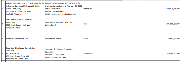 Kreditur terbesar kedua adalah West Realm Shires, perusahaan induk FTX US, dengan nilai utang sebesar $275.000.000. Sementara kreditur terbesar ketiga tidak diungkap identitasnya, dengan nilai utang sebesar $48.561.400.