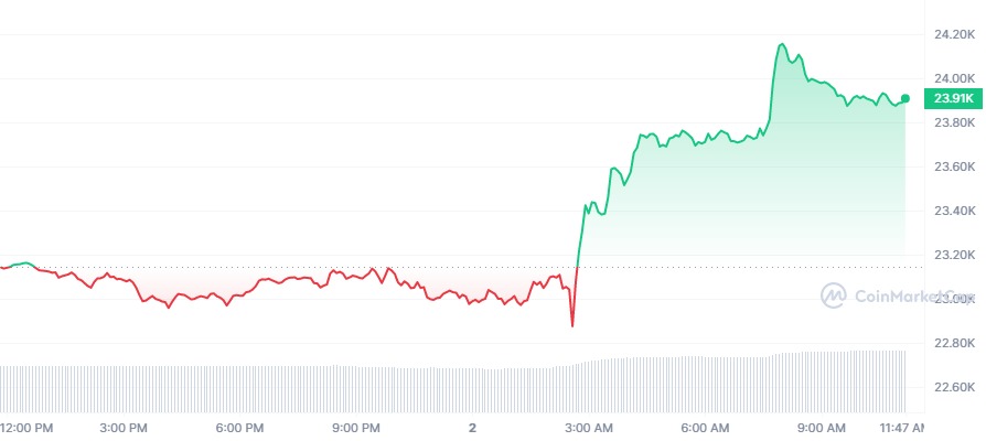 Setelah pidato Powell, Bitcoin (BTC) sempat jatuh ke bawah $23.000. Namun setelah itu mulai pumping hingga 6% ke $24.100 pada Kamis, 2 Februari 2023, pagi.