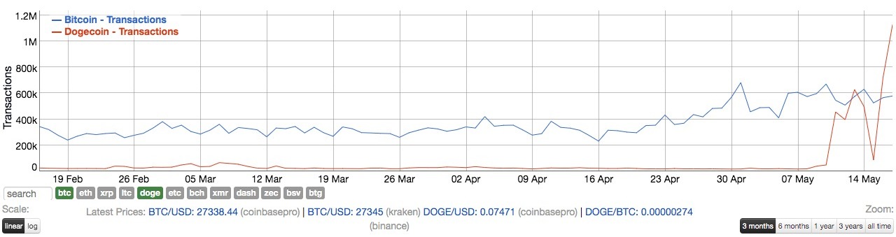 Menurut data Bitinfocharts, transaksi harian Dogecoin pada 17 Mei 2023, mencapai 1,12 juta transaksi. Jumlah ini dua kali lipat lebih banyak dari transaksi harian di jaringan Bitcoin pada hari yang sama, yang hanya mencapai 579.000 transaksi.