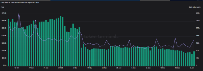 Menurut data Token Terminal, Pada 4 Januari, blockchain Solana mengalami kenaikan biaya transaksi sebesar 18,6% dan peningkatan pengguna aktif harian sebesar 15,8% dalam 24 jam.