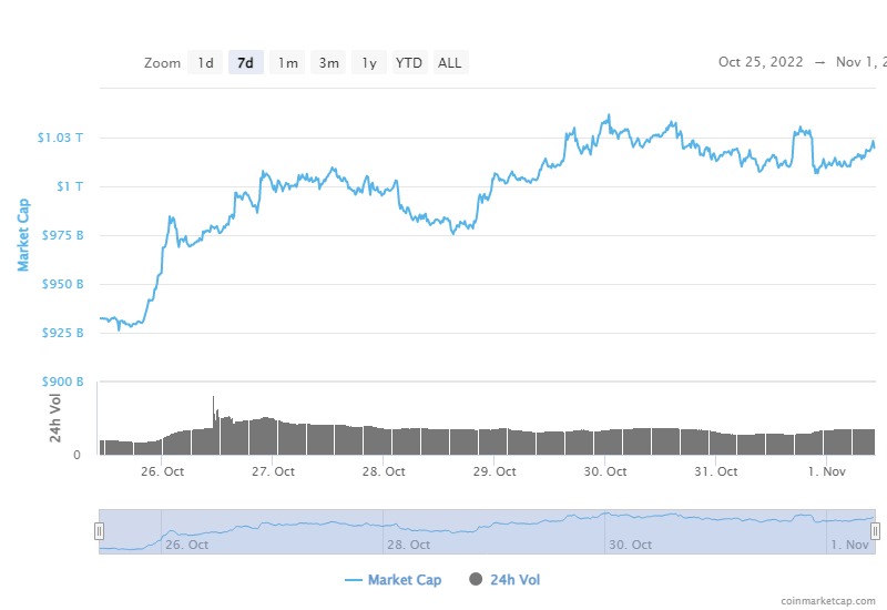 Peningkatan kapitalisasi pasar kripto juga dipicu oleh Bitcoin (BTC) yang mengalami kenaikan 5,5% dalam sepekan dan menyentuh titik psikologis $20.000. Agregat dari sekitar 20.000 altcoin ikut meningkat hingga 8,5% dalam periode 24-30 Oktober 2022.