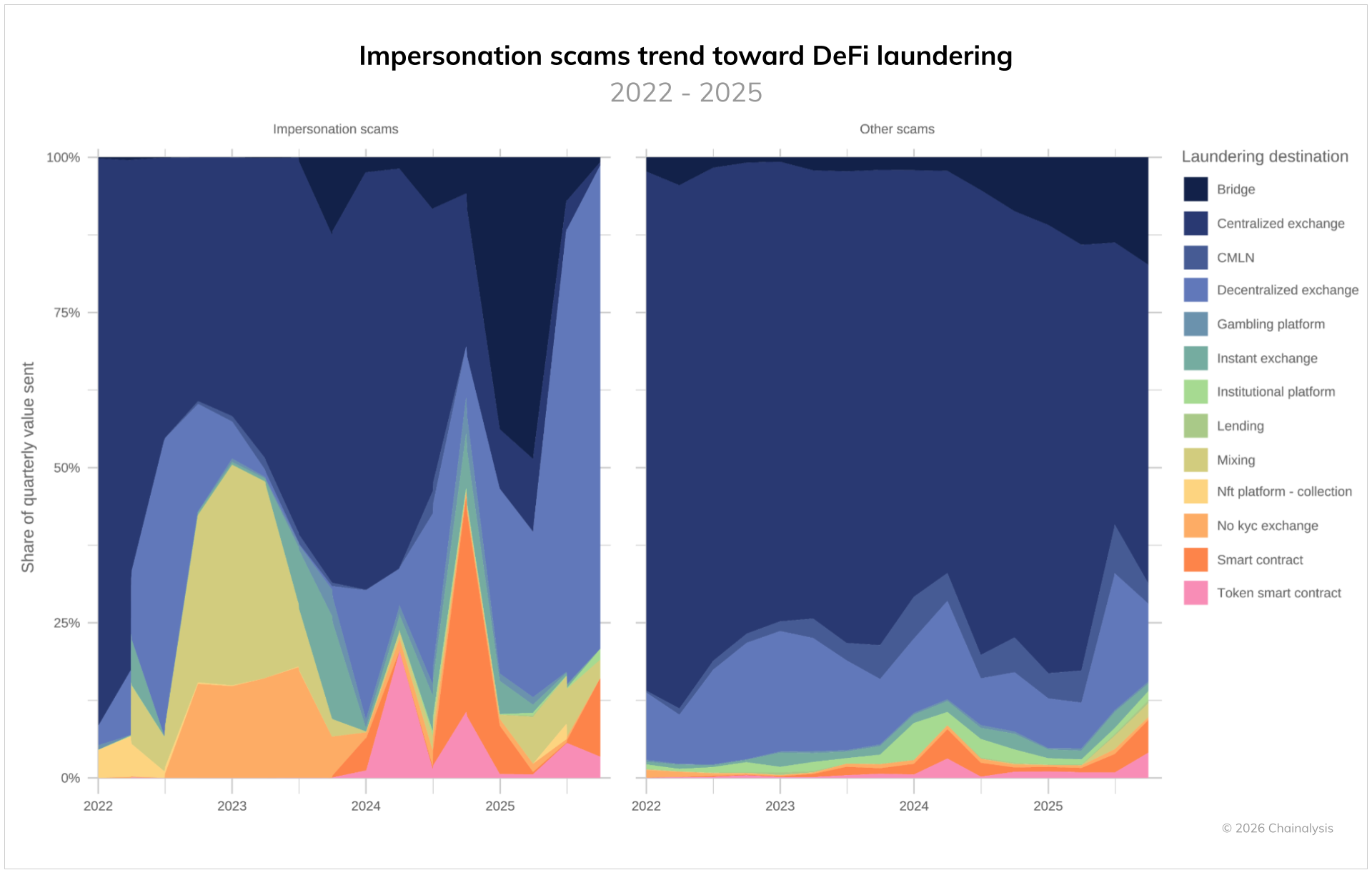 Chainalysis juga mencatat pergeseran taktik, di mana penipuan berbasis penyamaran mulai meninggalkan bursa terpusat dan beralih ke ekosistem keuangan terdesentralisasi (DeFi), seperti DEX, bridge, dan protokol on-chain lainnya untuk memindahkan hasil kejahatan. Menurut laporan tersebut, langkah ini mencerminkan tren desentralisasi operasi penipuan, memanfaatkan sifat permissionless DeFi agar dana tetap sulit dilacak.