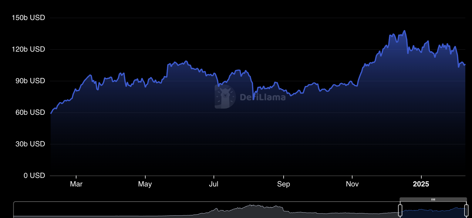 Angka ini mencerminkan penurunan tajam sekitar $13 miliar dari minggu sebelumnya yang mencapai $118,76 miliar. Saat ini, TVL DeFi hanya berjarak $5.85 miliar dari ambang psikologis $100 miliar, sebuah batas simbolis yang mencerminkan kepercayaan pasar.