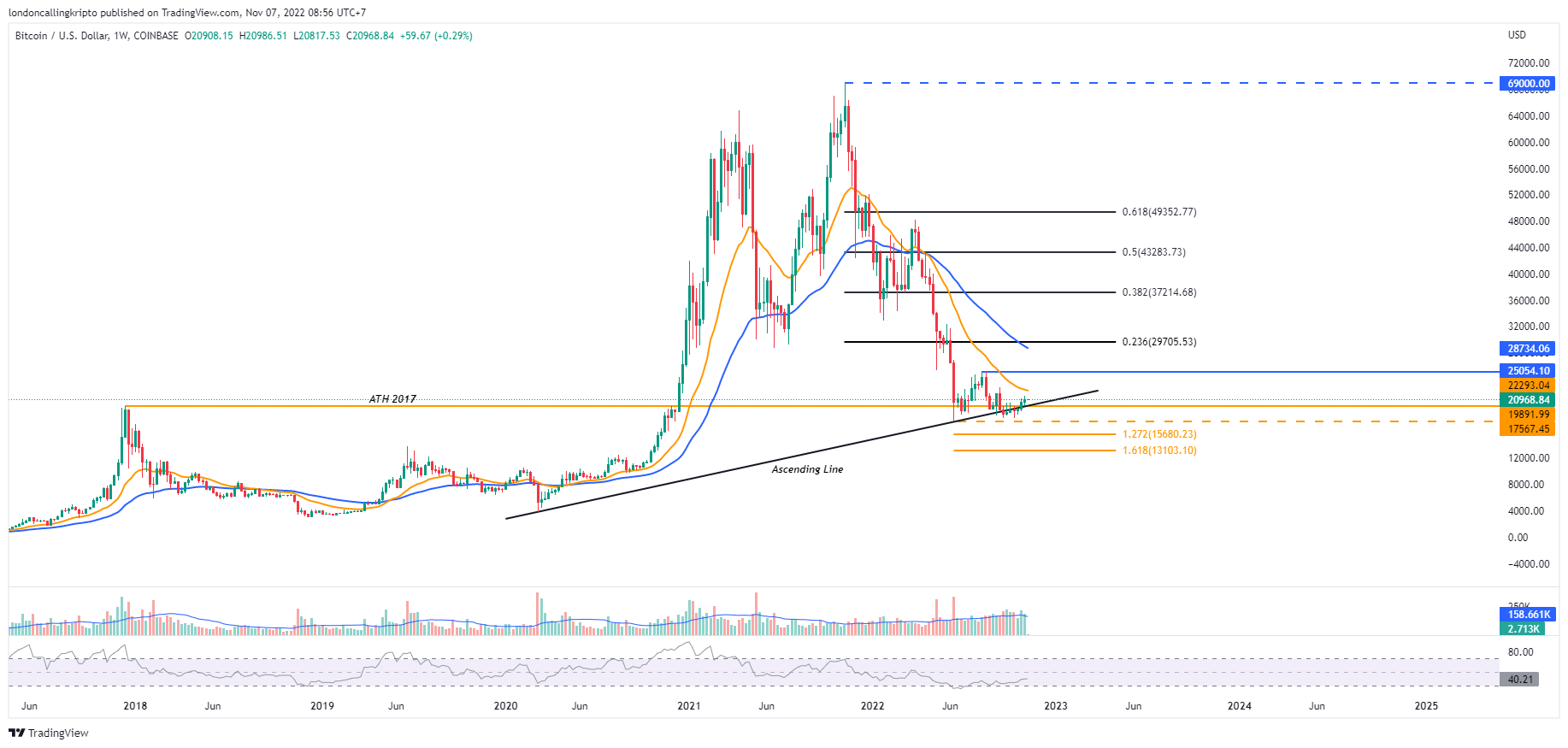 Bitcoin berhasil meneruskan tren positifnya setelah kandil mingguan ditutup hijau, naik sebesar 1,35%. Penutupan kandil mingguan pagi ini menjadi konfirmasi terhadap breakout terhadap ATH 2017 dan ascending line.