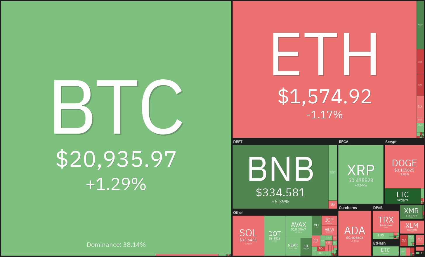 Weekly candle BTC pagi ini ditutup pada harga $20.909, level tertinggi berada pada harga $21.478 dan level terendah berada pada harga $20.032.
