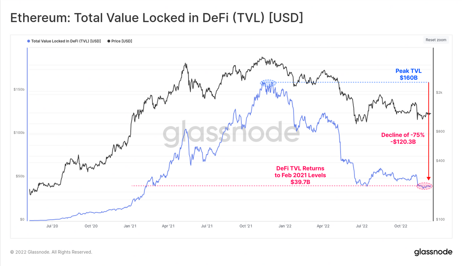 Menurut platform data analitik on-chain Glassnode, TVL DeFi di akhir 2022 telah turun 75% dari ATH atau sebanyak $120 miliar. Nilai ini setara dengan sekitar Rp1,8 kuadriliun.