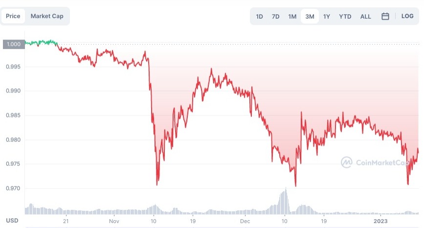 Meski demikian USDD yang seharusnya berpasak 1:1 dengan dolar AS ini masih jauh dari batas $1. Stablecoin algoritmik ini terpantau sudah mengalami depegging pada 17 Oktober 2022 dan belum kembali ke pasaknya sejak itu.
