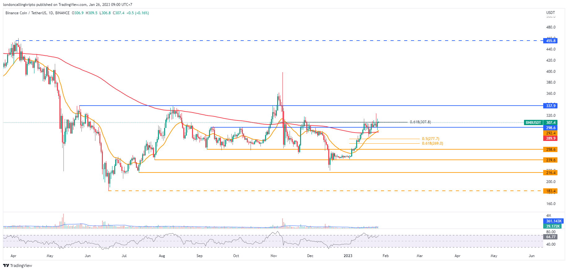 Apabila pergerakan harga BNB berhasil breakout dan didukung dengan volume perdagangan tinggi, kemungkinan harga BNB akan kembali menyentuh harga tertinggi pada 25 Mei 2022 di level $337,9.