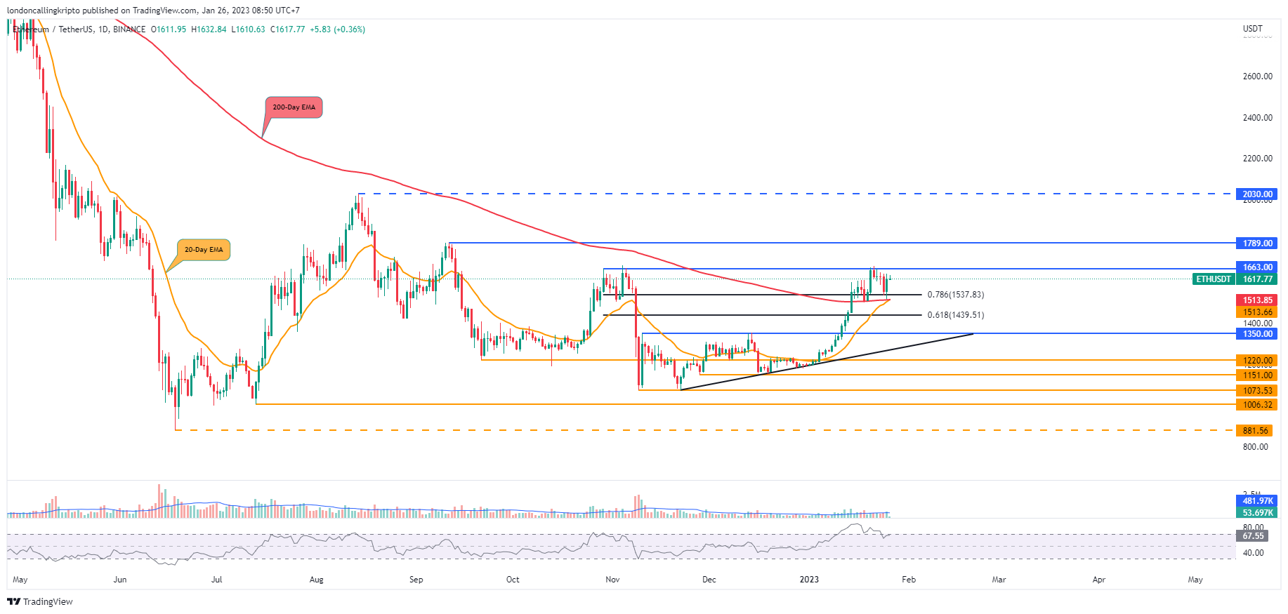 Pergerakan harga ETH kembali bounce setelah penurunan menyentuh titik support tersebut. Kenaikan harga ETH berpotensi kembali menyetuh resistance pada 20 Januari di level $1.663.