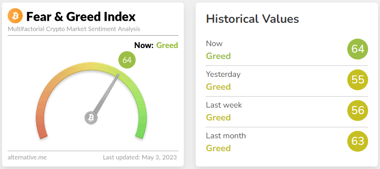 Penutupan positif pada kandil harian pagi ini berhasil mendorong kepercayaan diri para pelaku pasar. Fear and Greed Index meningkat cukup tinggi, sebesar sembilan poin hingga menyentuh level 64 dengan kategori Greed.