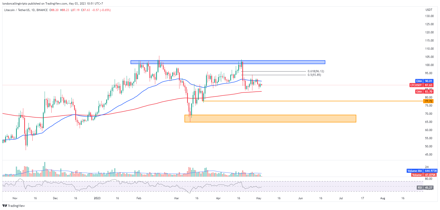 Pergerakan harga LTC mengalami penolakan ketika bergerak naik dan menyentuh dinamis resistance yang merupakan 50-day exponential moving average (EMA) di level $90,01 pada 29 April.