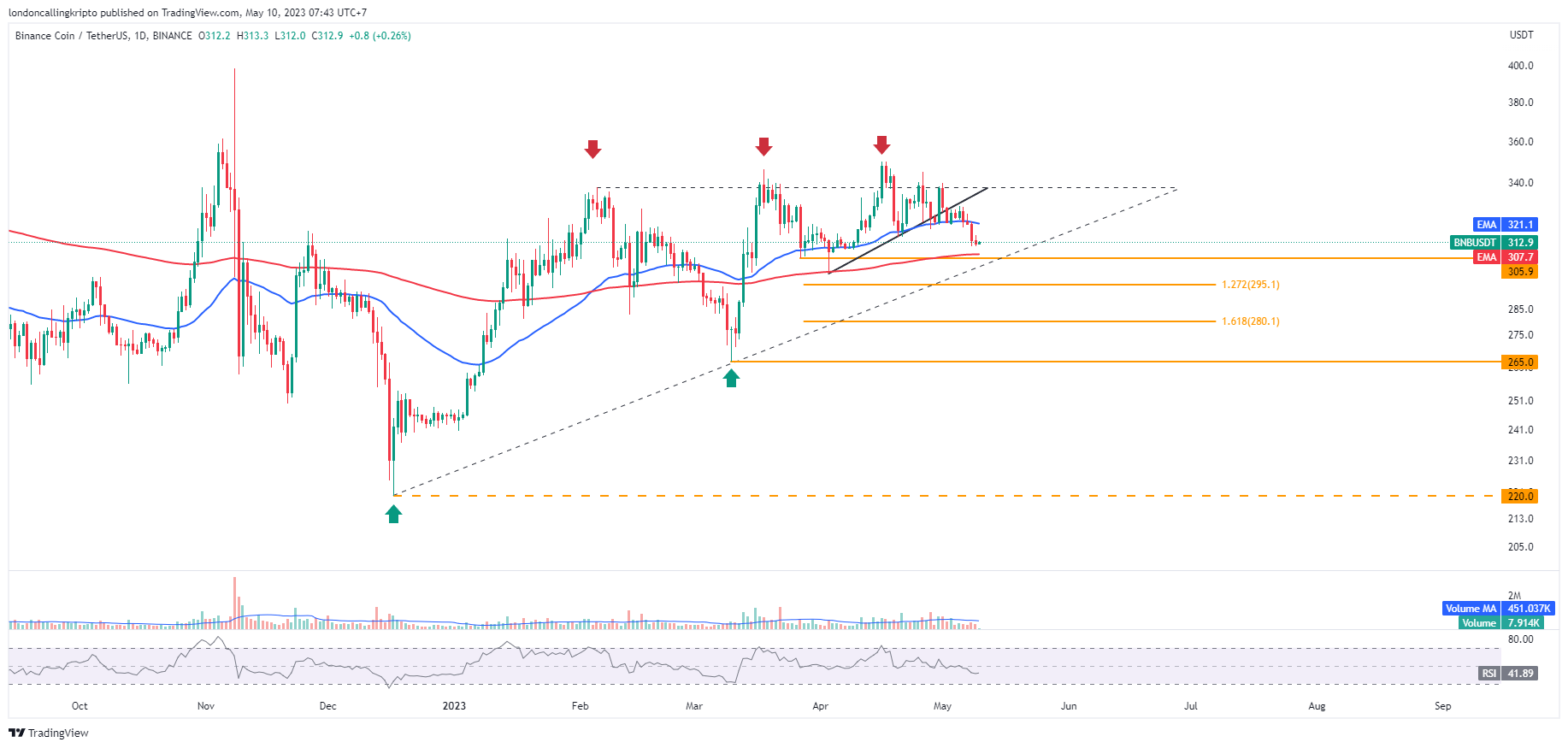 Penurunan harga BNB terlihat mendekati support yang merupakan harga terendah pada penutupan kandil harian 27 Maret dan 200-day EMA di level $305,9-$307,7.