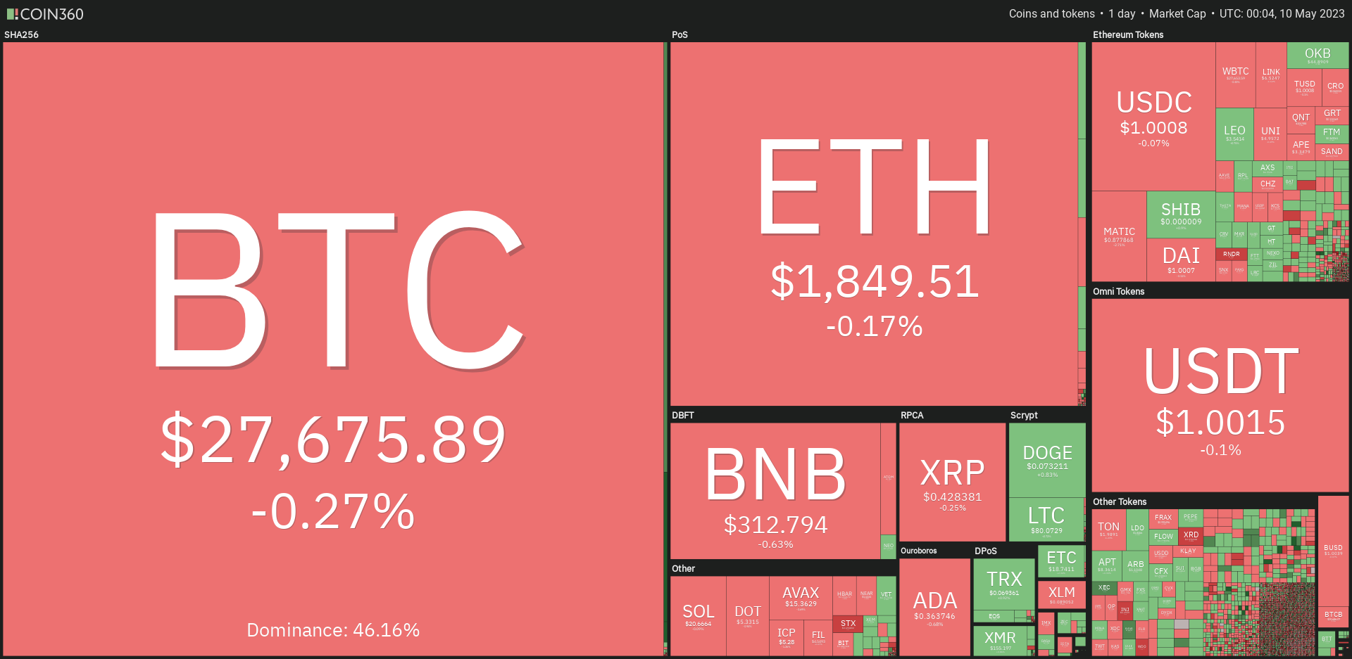 Penurunan harga tiga aset utama pasar kripto terlihat mulai melemah, meskipun masih mengalami penurunan harga. Bitcoin ditutup merah dengan penurunan sebesar 0,15%. ETH mengikuti dengan penurunan sebesar 0,06%, dan BNB mencatatkan penurunan sebesar 0,54%.