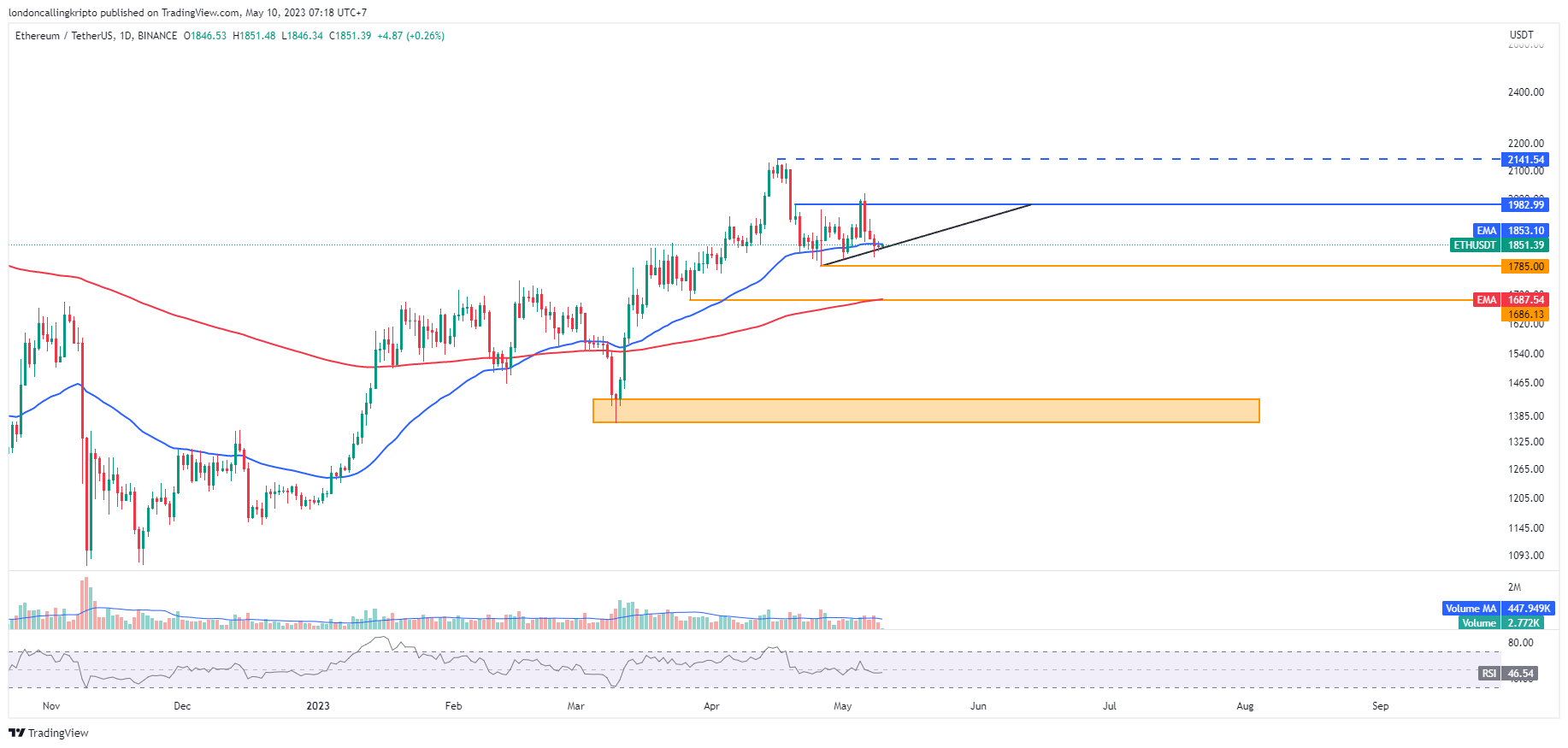Pergerakan harga ETH mengalami penurunan harga empat hari beruntun setelah laju bullish tertahan resistance yang merupakan harga tertinggi penutupan kandil harian 20 April di level $1.982.