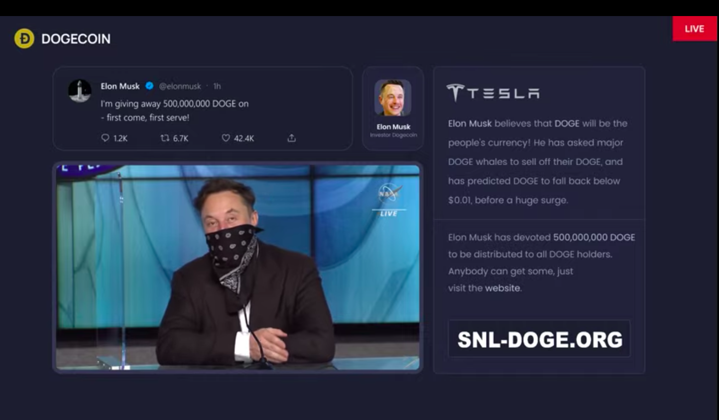 Pada sebuah tayangan di channel Youtube dengan nama SNL-News disiarkan sebuah tayangan langsung (live) yang seolah-olah Elon Musk sedang mengumumkan dirinya akan bagi-bagi giveaway DOGE sejumlah 500 juta. Video tersebut tayang pada pukul 02.00 WIB dini hari, Minggu, 9 Mei 2021.