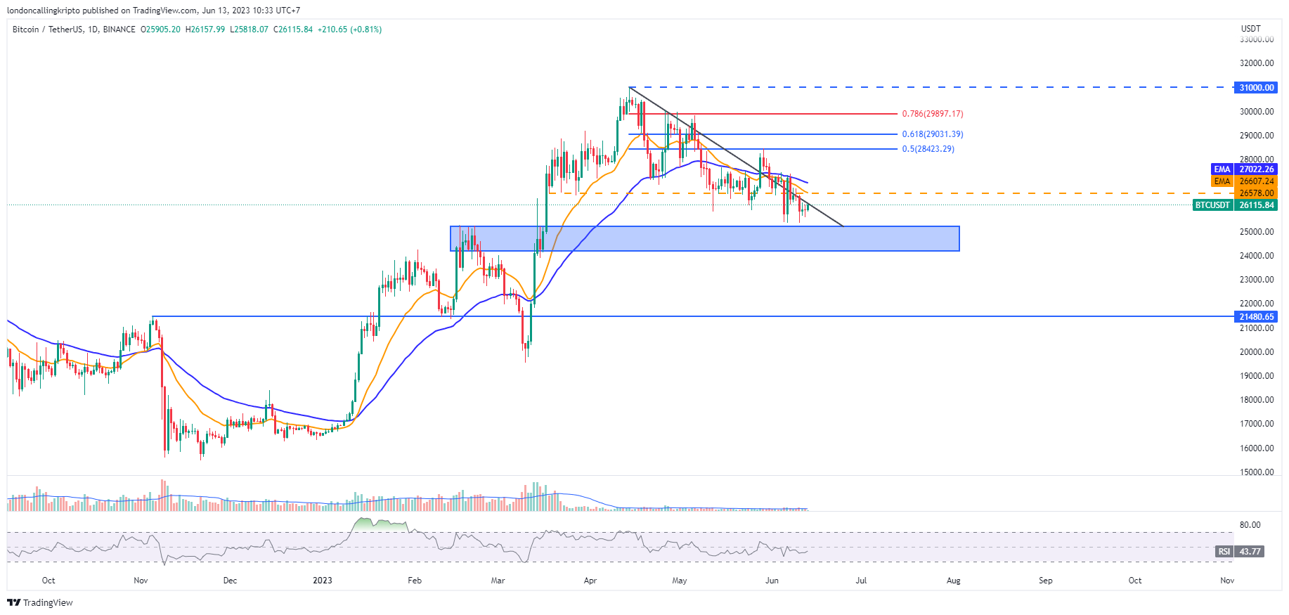 Daily candle BTC pagi ini ditutup pada harga $25.905, dengan level tertinggi berada pada harga $26.106, dan level terendah berada pada harga $25.602.