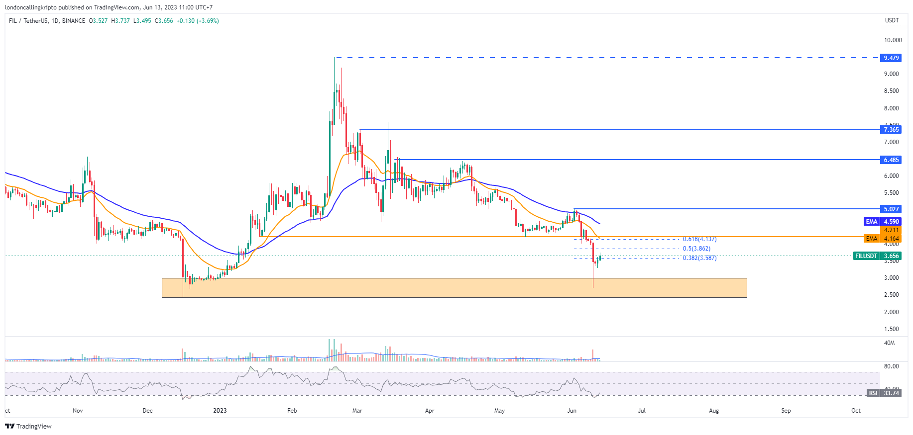 Pergerakan harga FIL mengalami penurunan tajam (dump) pada 10 Juni hingga menyentuh major support di level $2,420-$2,993 yang terbentuk pada 16 Desember 2022. Meskipun begitu, harga FIL berhasil ditutup diatas area support tersebut.