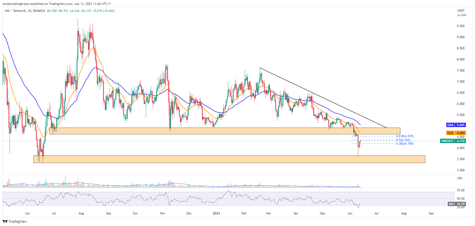 UNI perlahan bergerak naik setelah mengalami penurunan tajam pada saat pasar kripto crash akibat dari penurunan harga Bitcoin pada 10 Juni. Kandil harian UNI ditutup hijau dengan kenaikan yang cukup signifikan, sebesar 5,91%.